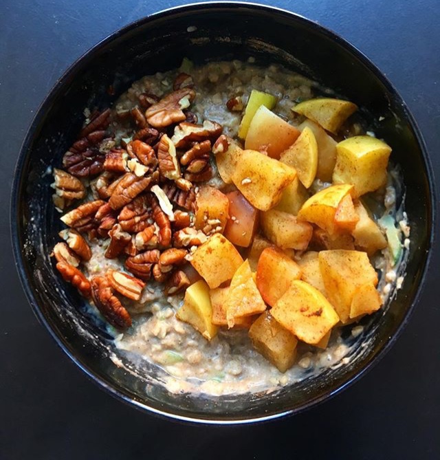 How much does an apple cost? Around 12p. Slice it cold, put it on top of your porridge with yoghurt and you have a refreshing addition to your porridge. Stew it in cinnamon and water, and you have apple pie porridge.