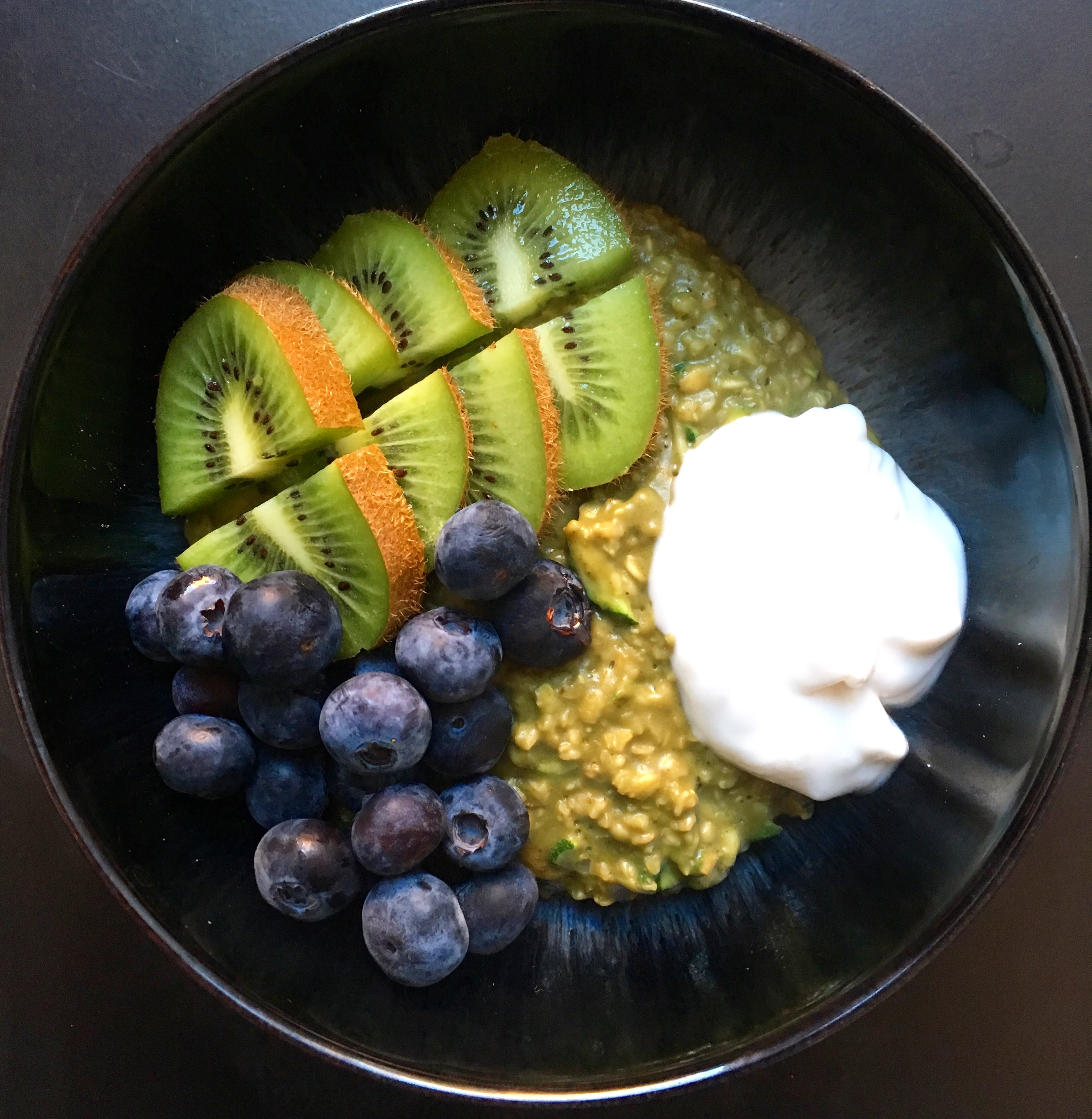 Try avoiding sugar in the morning to help with anxiety and panic. Sugar has a habit of getting us buzzed then …… crashing and can also cloud the mind. I’ve topped these zoats with kiwi and blueberries which are both LOW IN SUGAR fruits.