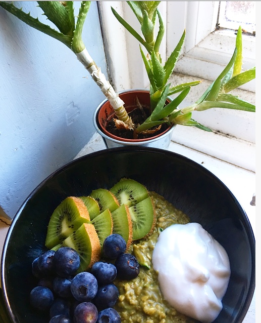 sweetener (vanilla protein powder, vanilla extract/maple syrup/honey) . Heat for another 2 mins. Stir. Heat for an extra one minute if you want it slightly thicker. You can add more milk if needed. - Top with sliced kiwi and blueberries. Add a dollop of coconut yoghurt and almond/cashews (optional)