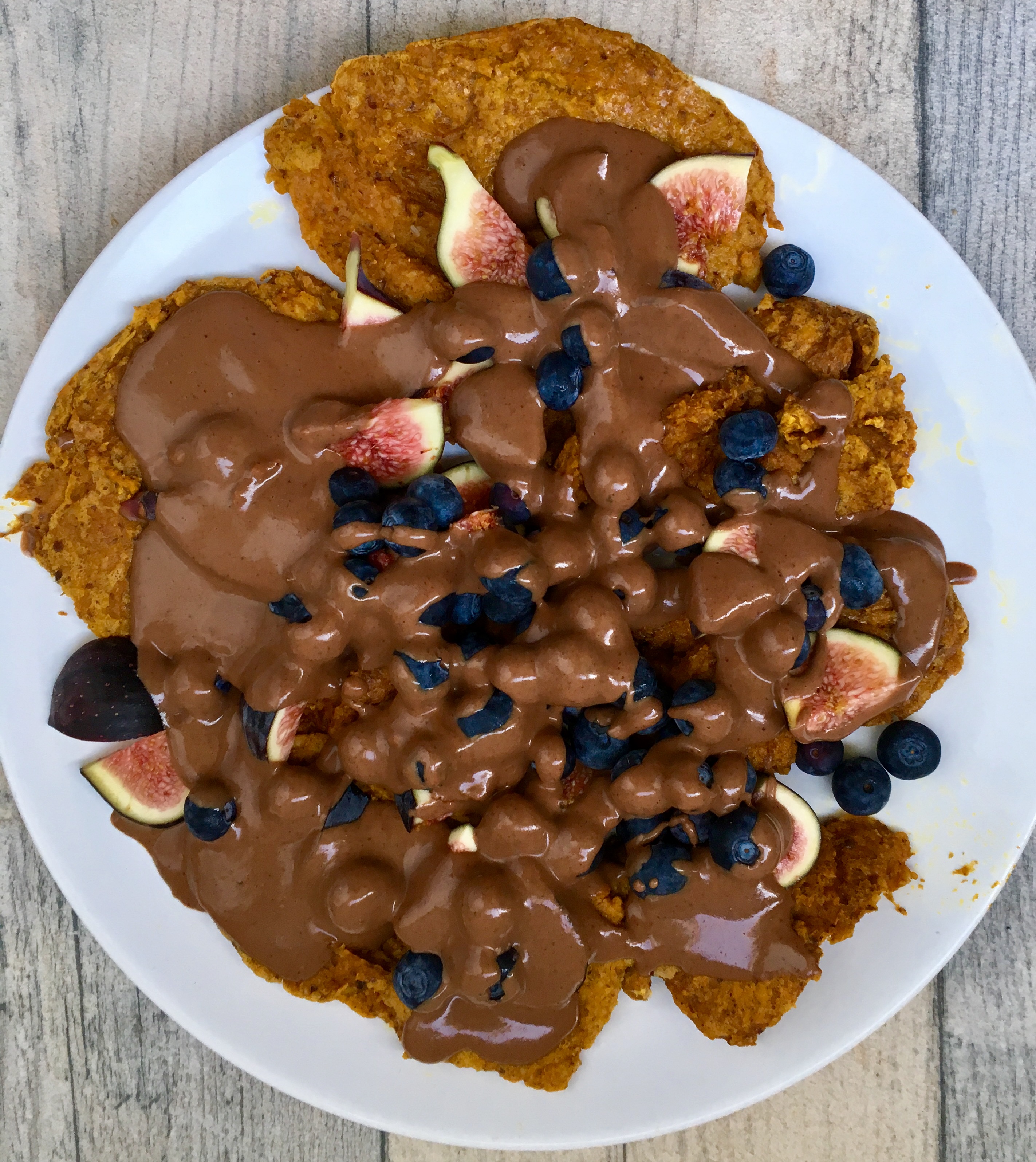 - Once all your pancakes are done, top with the sauce and figs and blueberries (or other fruit of your choice)