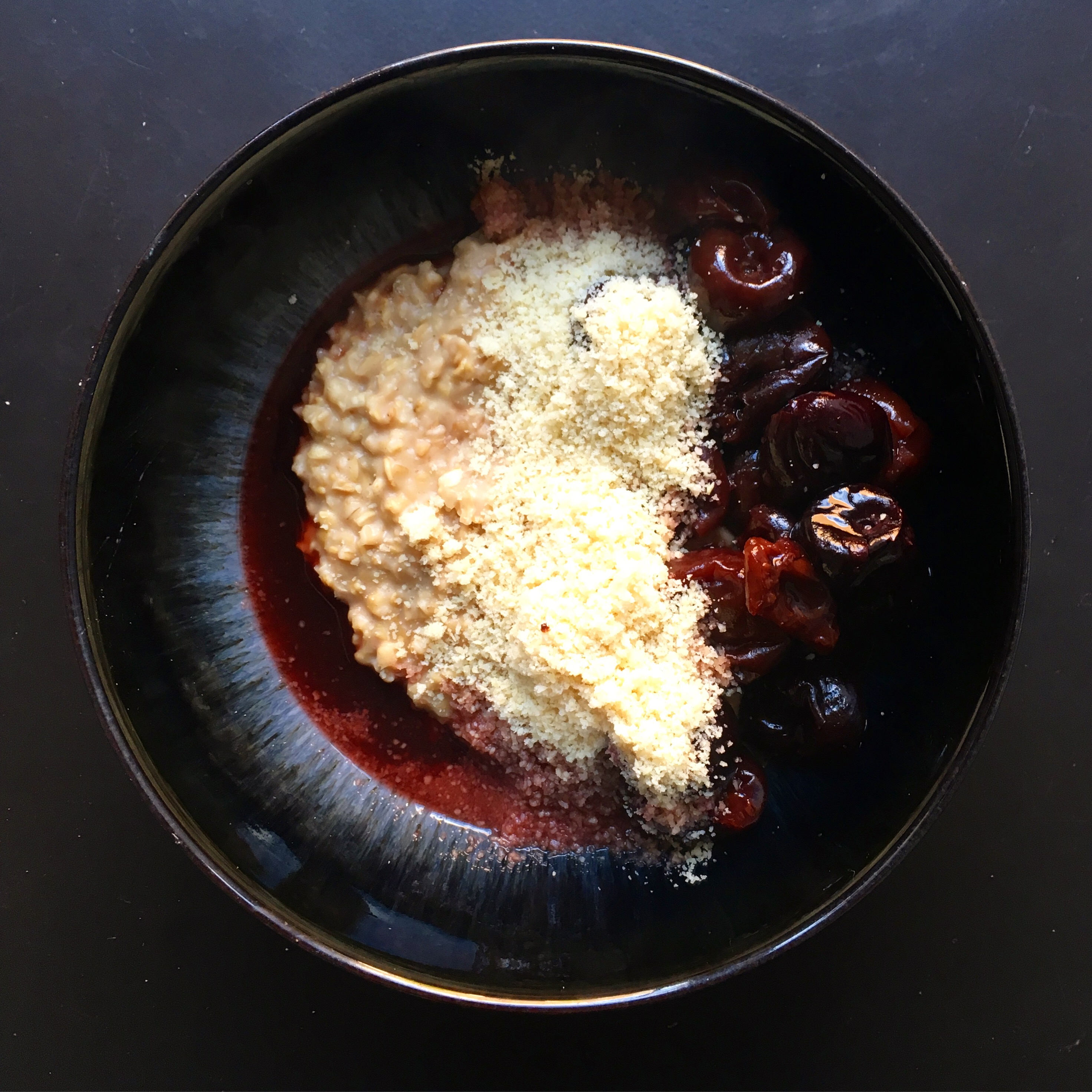 - Top with ground almonds and stewed cherries. Make sure you add the cherry juices – they are super sexy and naturally sweet.