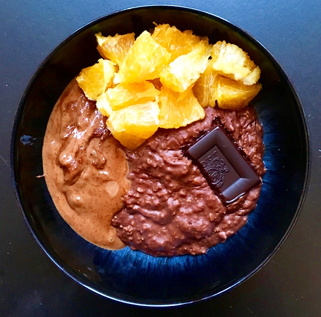 - Top with chocolate orange nut butter/ 1 square of orange dark chocolate, orange segments and a square of dark chocolate (double chocolate – #liveyourbestlife)