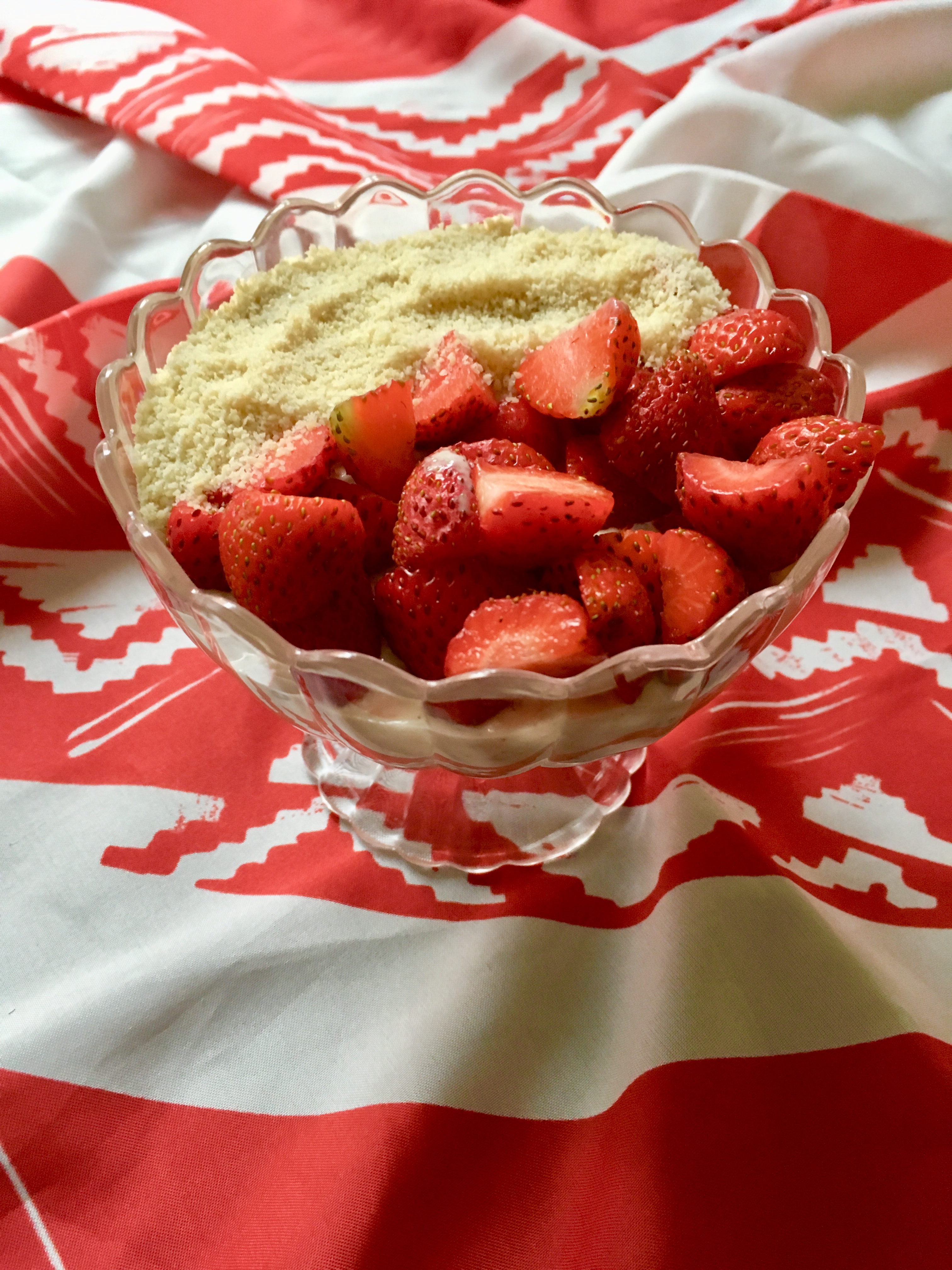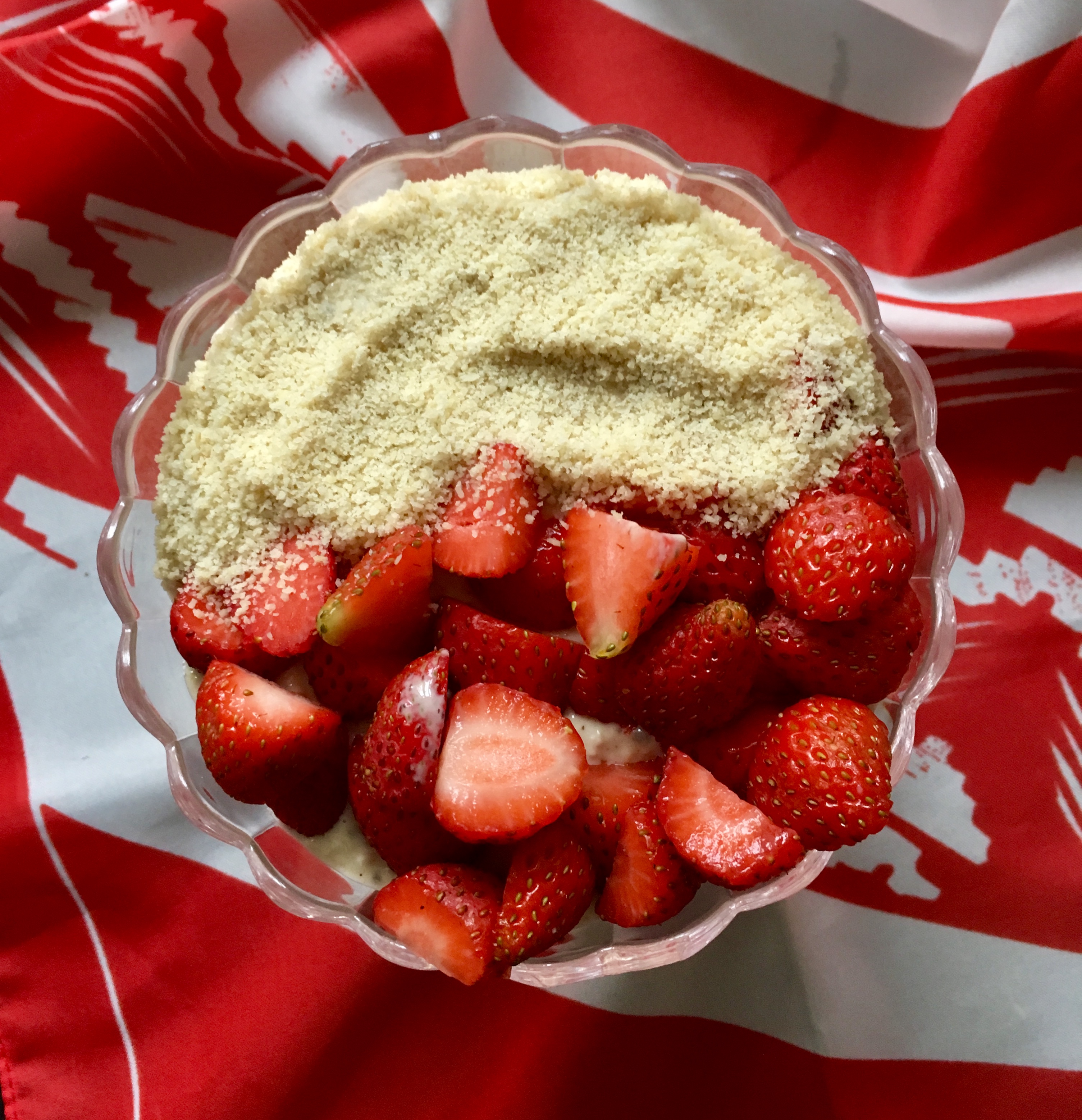- Top with sliced strawberries, ground almonds and cashew butter.